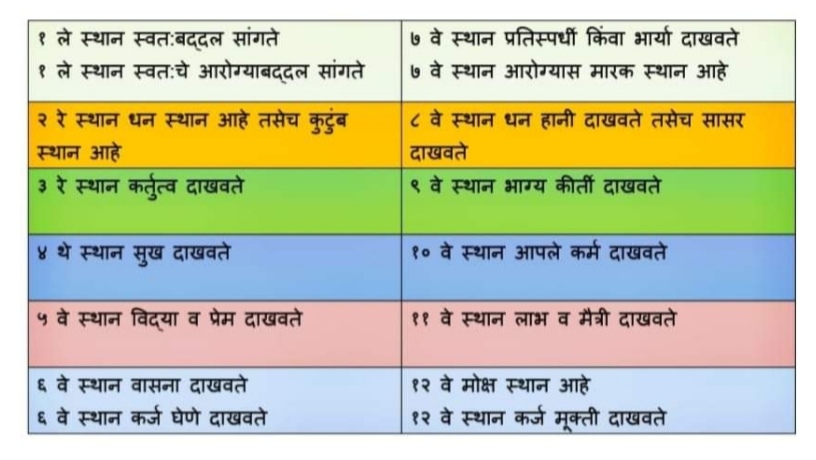 आता या नियमाची एखादे स्थानापासून ७वे स्थानाची कार्य परिणामाची थोडी गंमत सोबतच्या चार्ट मध्ये दिलेली आहे. आपणही १ ले व ७ वे स्थान मध्ये कोणते ग्रह, राशी येतात व त्याचा परिणाम हा पूरक असेल का प्रतिकूल याचा अभ्यास करू शकता. प्रत्येक ग्रहाला ७ वी पूर्ण दृष्टी असते. याचाच अर्थ स्थित ग्रह त्याचे ७ वे स्थानाचा पुरकता अथवा प्रतिकुलता याचे परिणाम बदलू शकतो.