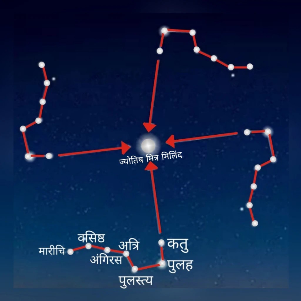 सप्तर्षी हा आकाशात स्थित असलेल्या मारिची, वसिष्ठ, अंगिरस, अत्रि, पुलस्त्य, पुलह आणि क्रतु या सात तारकांचा समुह आहे. पुलह व क्रतु तारकांच्या आंतराच्या ५ पट अंतरावर सरळ रेषेत वाढवत नेले की ध्रुव तारा आपणांस दिसतो. विश्वाची निर्मिती स्थापित करण्यात याला सर्वात महत्त्व आहे. उत्तर ध्रुव व दक्षिण ध्रुव या अक्षाच्या मधे सर्पिल आकार असलेली आपली आकाशगंगा अनादि अनंत काळ गोलाकाल फ़िरत आहे. उत्तर ध्रुव तारका ला संस्कृत साहित्यात ध्रुव नक्षत्र म्हणतात. जे सर्वदा स्थिर व अढळ असते. सप्तर्षी हा आकाशात स्थित असलेल्या मारिची, वसिष्ठ, अंगिरस, अत्रि, पुलस्त्य, पुलह आणि क्रतु या सात तारकांचा समुह आहे. त्यामध्ये आणखी एक तारा किंचित दिसतो, ज्याला “अरुंधती” म्हणून ओळखले जाते. ध्रुव कालचक्रांचे केंद्र आहे ज्याभोवती सप्तर्षी मंडळ घड्याळाच्या दिशेने या निश्चित केंद्राभोवती फिरत आहे.