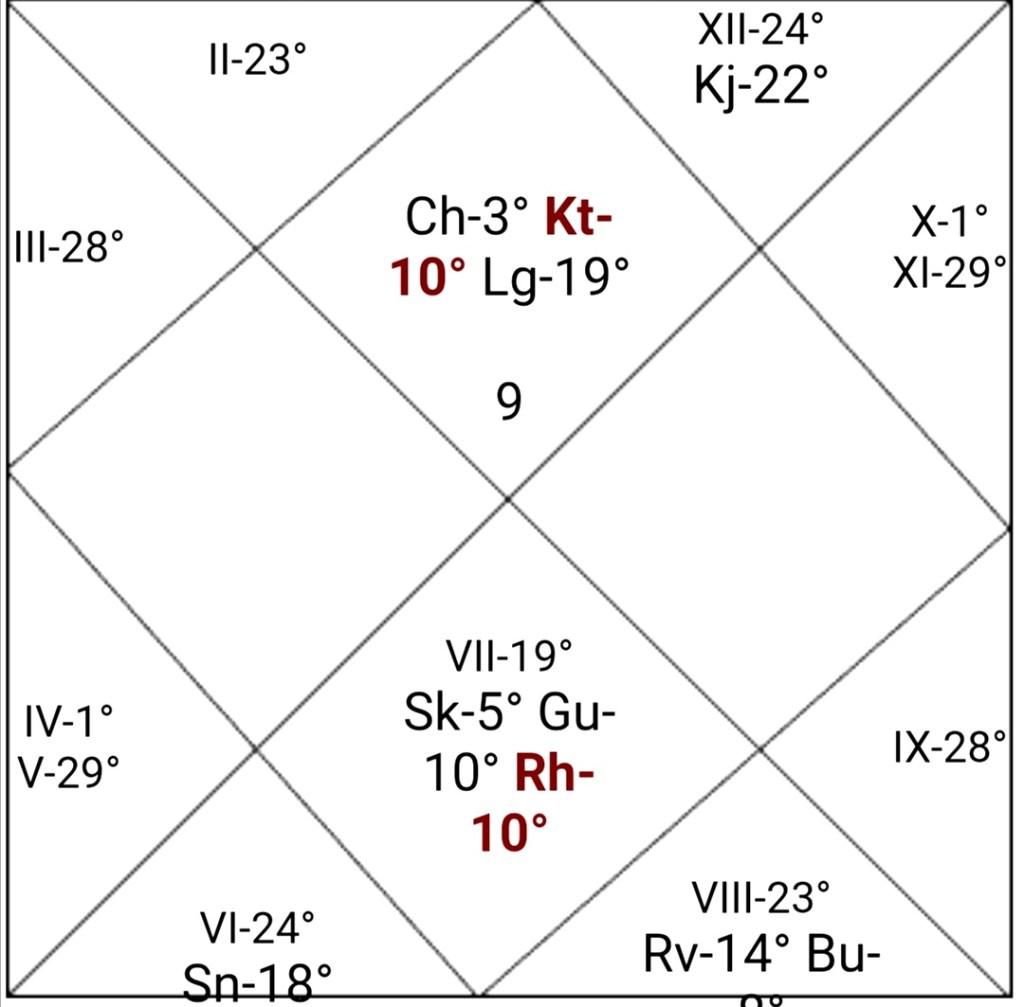 १ ले व ४ थे (सुख) स्थानाचा अधिपती गुरु सुद्धा भार्या स्थानी (७ वे स्थान) आहे ज्याची अंतर्दशा चालू आहे.