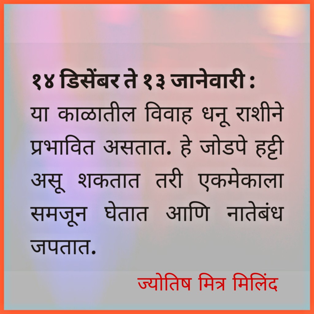१४ डिसेंबर ते १३ जानेवारी या दरम्यान झालेला विवाह Written by jyotish mitra milind ज्योतिष मित्र मिलिंद Share this: Share on X (Opens in new window) X Share on Facebook (Opens in new window) Facebook More Email a link to a friend (Opens in new window) Email Like Loading... Related Leave a comment Cancel reply Δ
