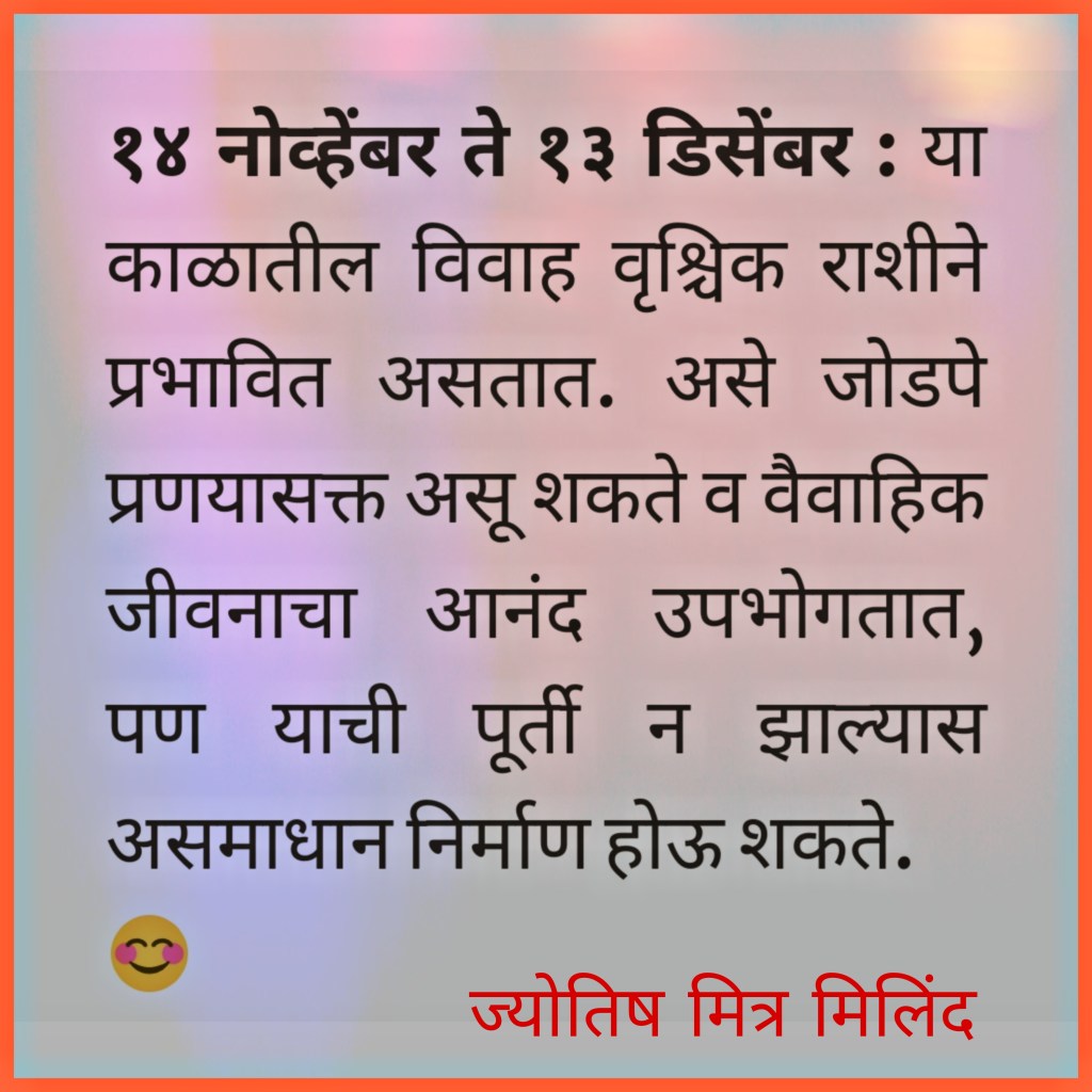 १४ नोव्हेंबर ते १३ डिसेंबर या दरम्यान झालेला विवाह Written by jyotish mitra milind ज्योतिष मित्र मिलिंद Share this: Share on X (Opens in new window) X Share on Facebook (Opens in new window) Facebook More Email a link to a friend (Opens in new window) Email Like Loading... Related Leave a comment Cancel reply Δ