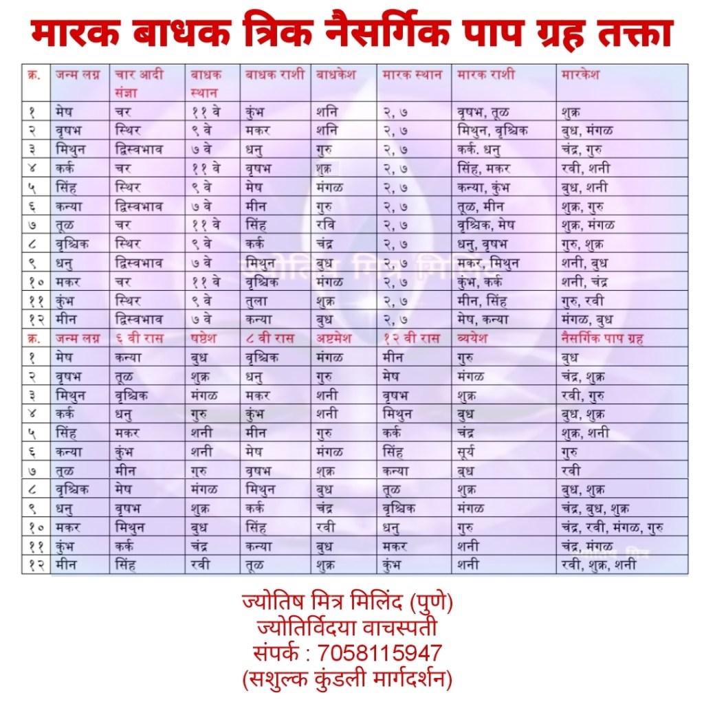 १) चर लग्नाकरिता एकादश भाव बाधकस्थान म्हणजेच त्याच्या राशीचा स्वामी बाधक स्थानाधिपती असतो.
