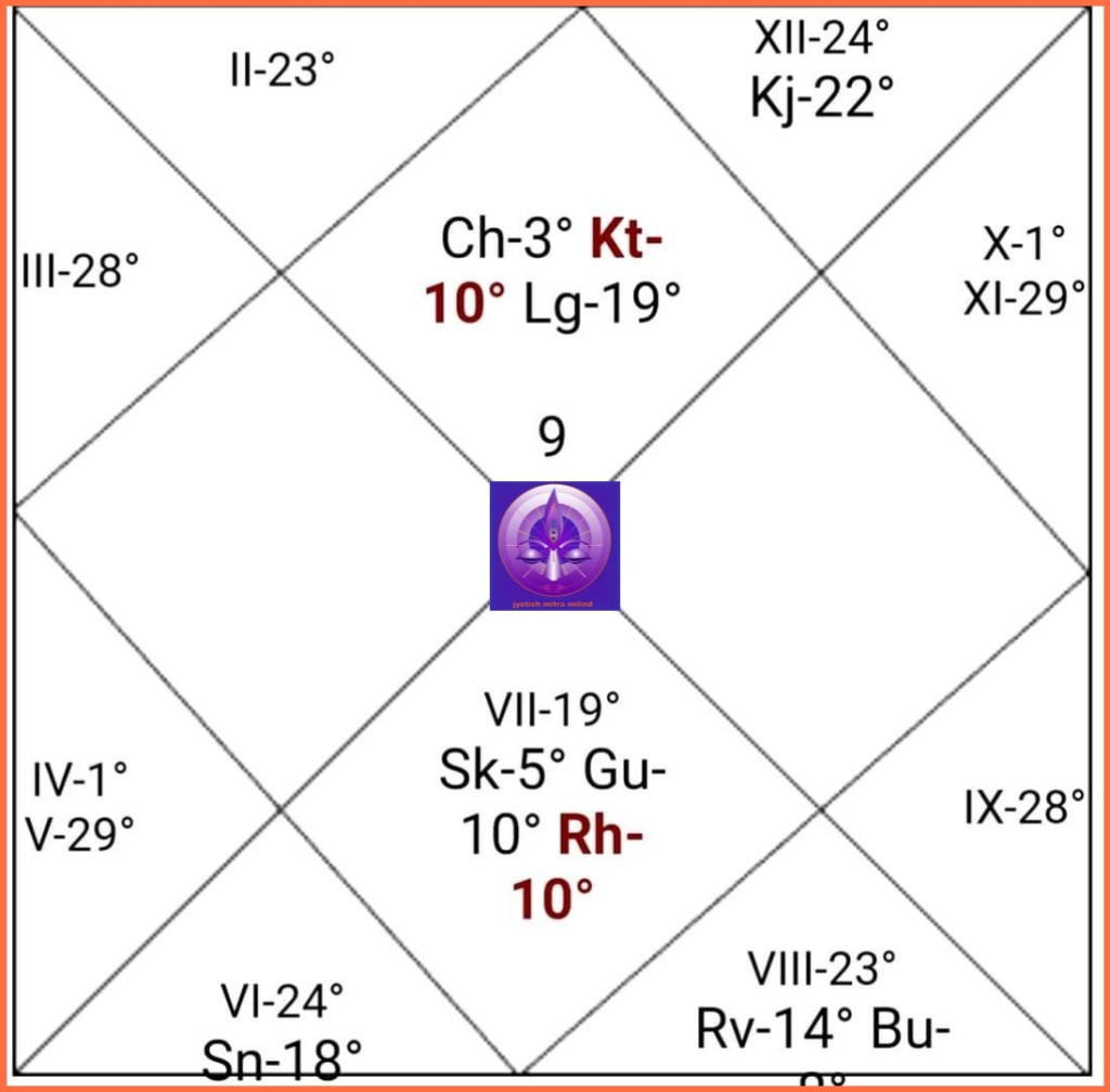 धनु लग्नाची ही जन्म पत्रिका. लग्न स्थानी चंद्र व केतू ६व्या स्थानात असला तरी शनी पंचम भावात, सप्तमात राहू, शुक्र, गुरु. अष्टमात रवी व बुध आणि व्यय स्थानात मंगळ अशी ग्रह स्थिती.
