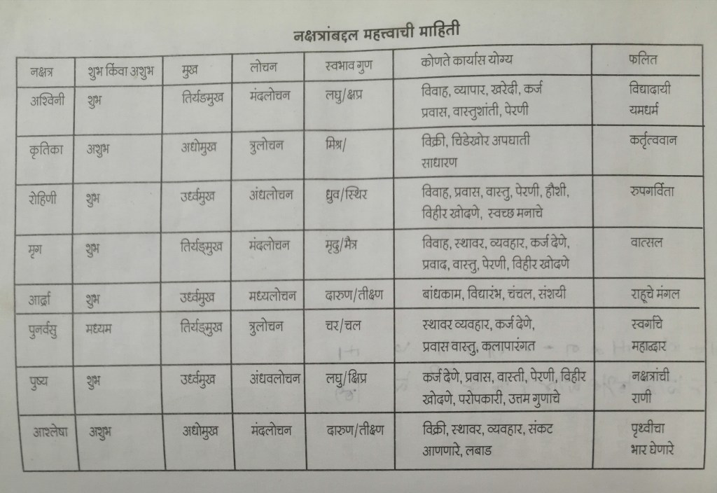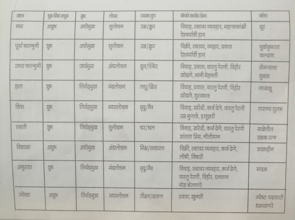 असे हे जन्म नक्षत्राचे गुण असले तरी कुंडली फलितात इतरही बाबींचा विचार करुन निर्णय द्यावा लागतो. उदा. राशीची स्थानगत फले व त्यांच्यातील योग, ग्रह दृष्ट्या व इतर बाबी यांचा सांकल्याने पूर्वीच्या प्रकरणात विचार मांडला आहेच. सोबत नक्षत्रांचे शुभ-अशुभत्व, मुख, लोचन, स्वभाव गुण, कोणते कार्यास योग्य व नक्षत्र फलित यांचा तक्ता जोडला आहे. हा तक्ता, कुंडली – ग्रह नक्षत्राधारे फलादेशाकरता, तसेच निरनिराळ्या कार्याचे मुहूर्ताकरता उपयोगी पडेल.