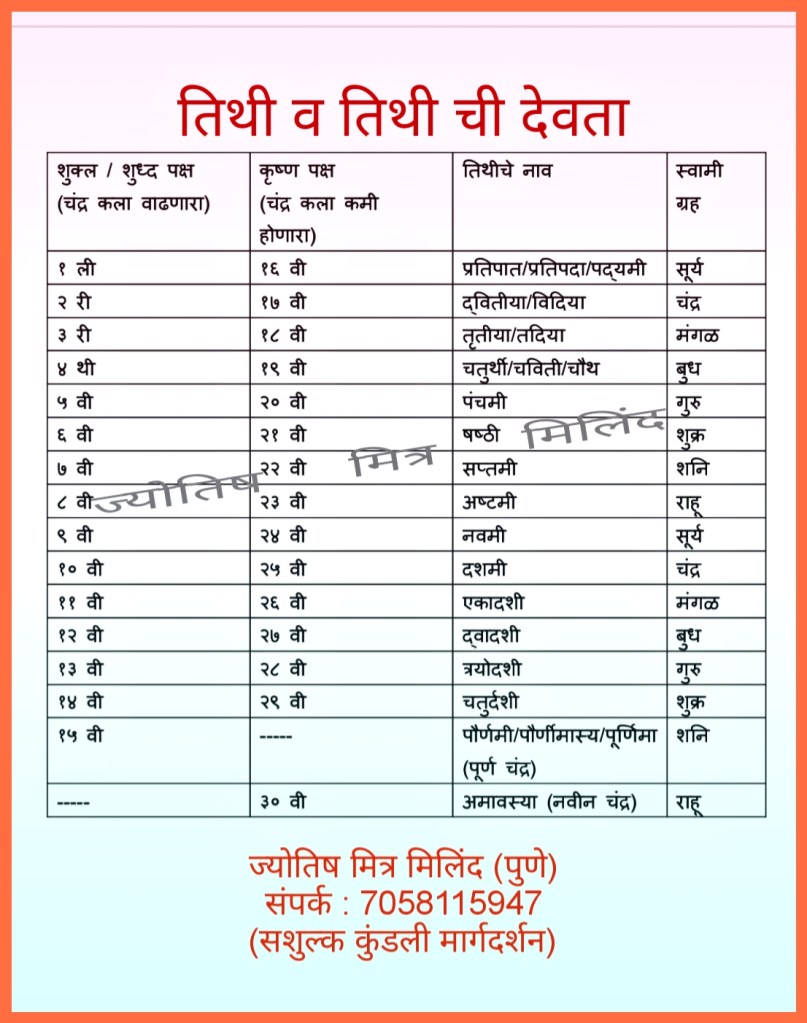 आपल्या माहितीसाठी सोबत तिथी व तिचा ग्रह स्वामी याचे कोष्टक देत आहे.