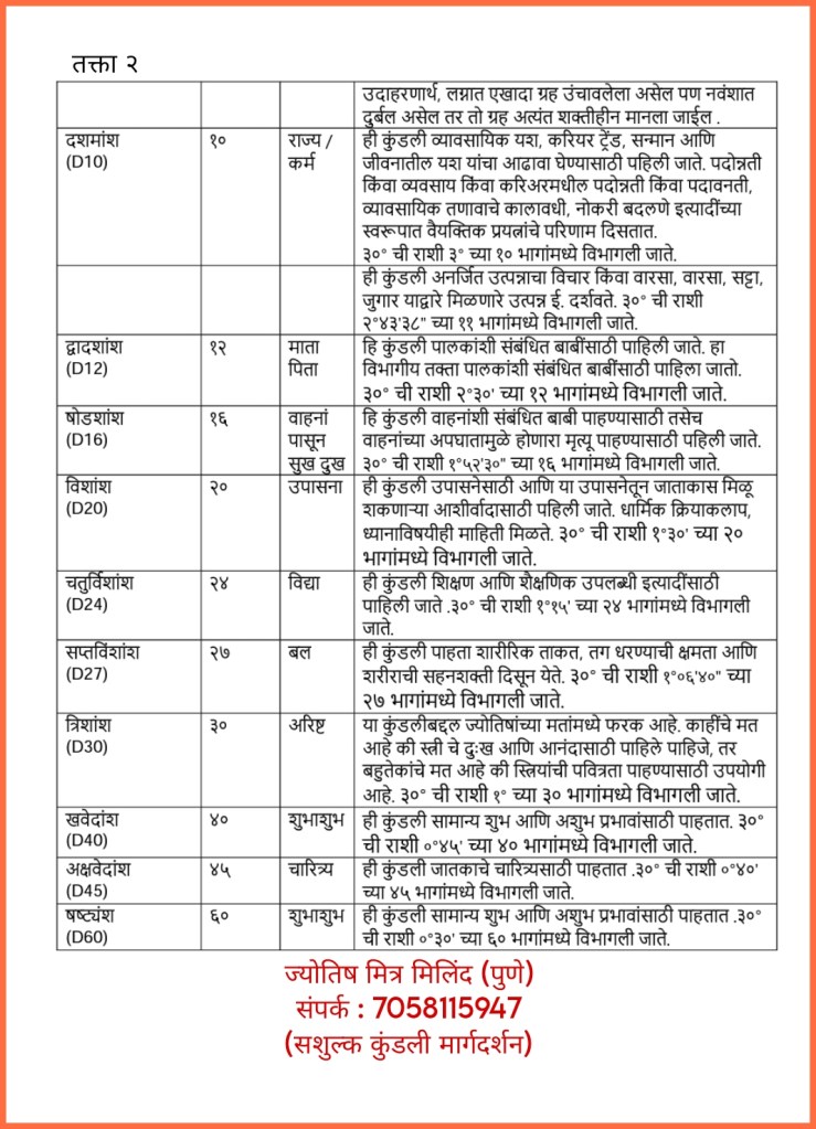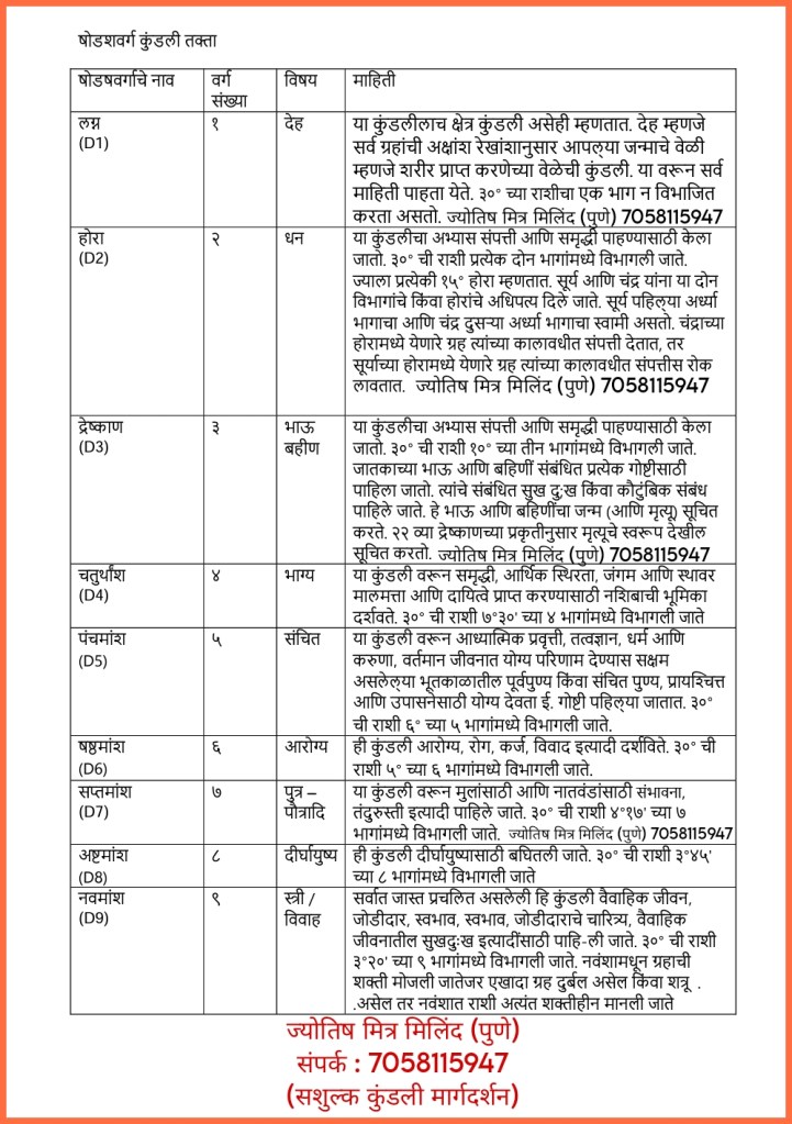 सोबत तोंड ओळख होण्यासाठी तक्ते देत आहे, जेणेकरून तुम्हाला कोणत्या विभाजनास काय नाव आहे व किती अंशाचे किती भाग केले जातात व त्यावरून कोणते फळ पाहिले जाते याची माहिती होईल.