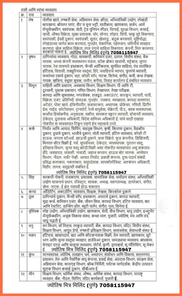 या विषयाला धरूनच कोणती रास काय व्यवसाय दर्शवते, हे स्थूलमानाने देण्याचा प्रयत्न केला आहे.