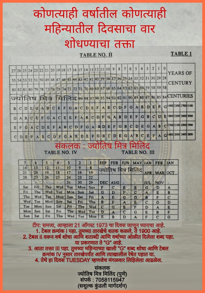 विषय : कोणत्याही वर्षातील कोणत्याही महिन्यातील दिवसाचा वार शोधण्याचा तक्ता