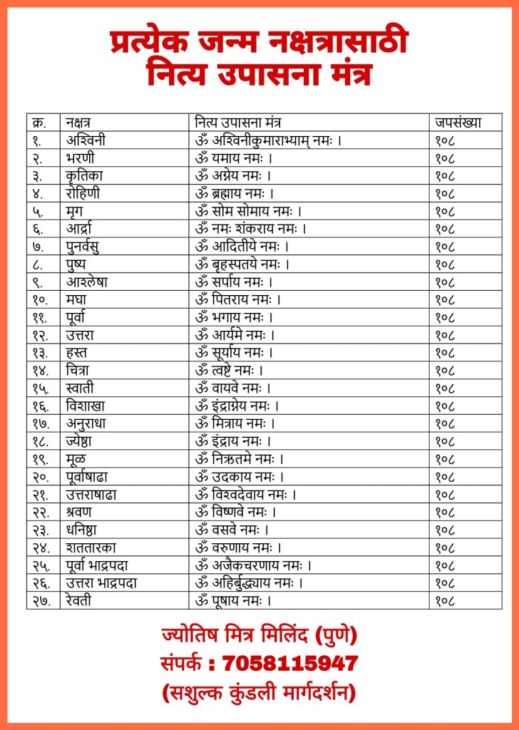 आपल्या माहितीसाठी येथे प्रत्येक जन्म नक्षत्रासाठी नित्य उपासना मंत्र देत आहे.