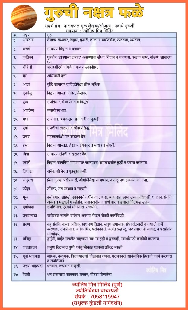 आज आपण गुरुची नक्षत्र फळे पाहणार आहोत. नामांकित ज्येष्ठ ज्योतिषाचार्य नवाथे गुरुजी यांचे नाक्षत्र फल या पुस्तकातील हे संकलन आहे. मी फक्त तक्ता स्वरुपात आपले माहितीसाठी देत आहे.