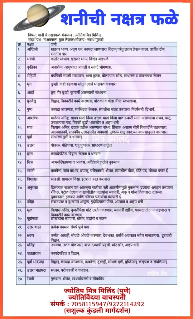 विषय : शनीची नक्षत्र फळे
