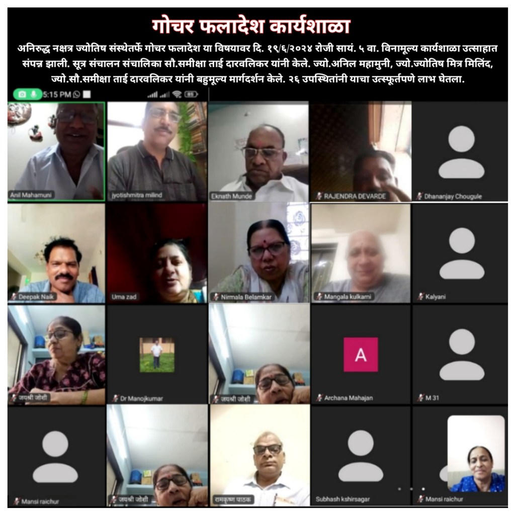 अनिरुद्ध नक्षत्र ज्योतिष संस्था (मुंबई) तर्फे गोचर फलादेश या विषयावर दि. १९/६/२०२४ रोजी सायं. ५ वा. विनामूल्य कार्यशाळा उत्साहात संपन्न झाली.
