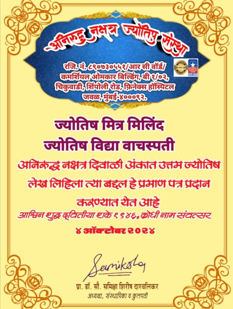 उत्तम लेख लिहिल्याबद्दल आयएसओ ९००१ संस्थेतर्फे प्रशस्ती पत्र Written by jyotish mitra milind ज्योतिष मित्र मिलिंद (पुणे)ज्योतिर्विदया वाचस्पतीसंपर्क : 7058115947(सशुल्क कुंडली मार्गदर्शन) Share this: Click to share on X (Opens in new window) X Click to share on Facebook (Opens in new window) Facebook More Click to email a link to a friend (Opens in new window) Email Like Loading... Related Leave a comment Cancel reply Δ