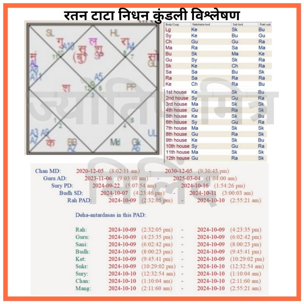 ही ग्रह व दशा स्थिती पुरेशी बोलकी आहे व त्यामुळे रतनजी टाटा यांचेसारखे एक अनमोल रत्न ०९ ऑक्टोबर २०२४ रात्री ११.३० वा. बीच कॅन्डी हॉस्पिटलमध्ये काळाच्या पडद्या आड गेले.
