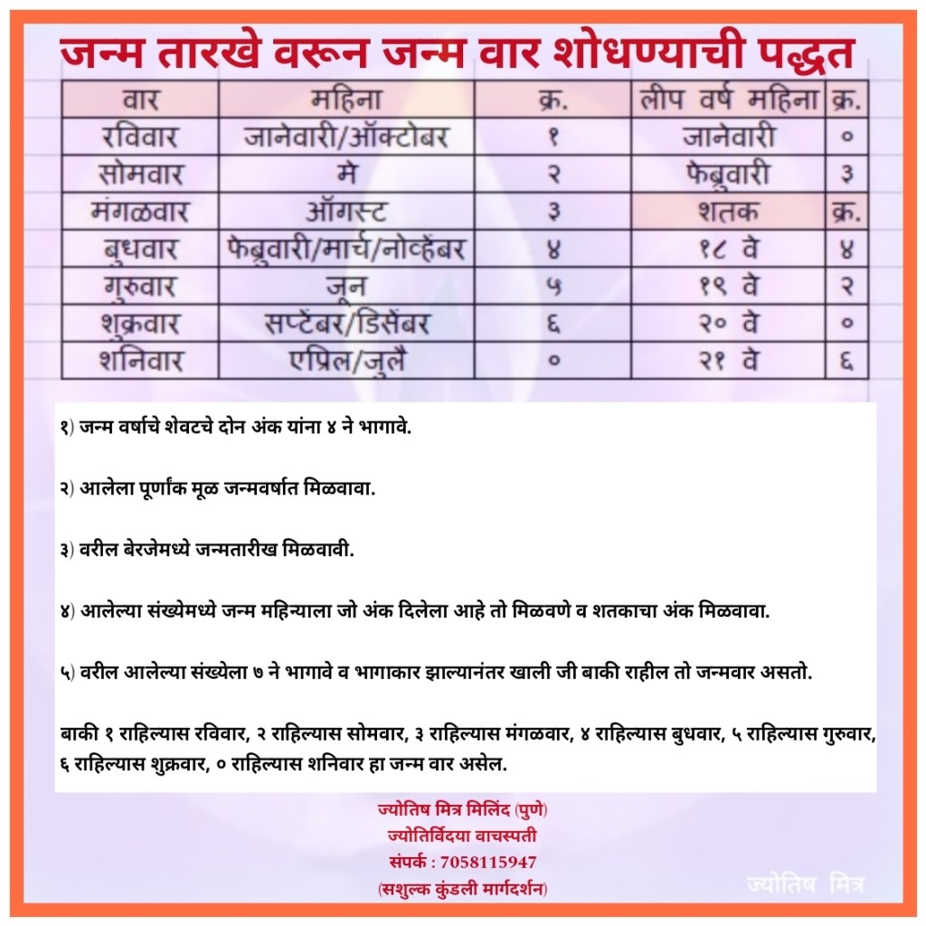 विषय : जन्म तारखे वरून जन्म वार शोधण्याची पद्धत