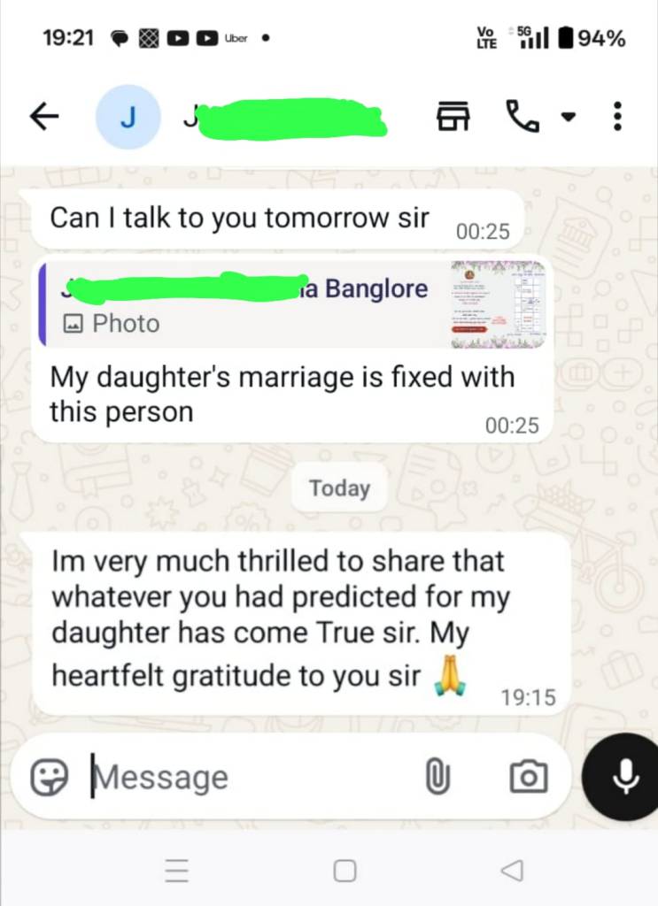 साधारण वर्षभरापूर्वी मुलीच्या विवाहयोग गेली 4 वर्षे येत नव्हता, त्यासाठी कुंडली मार्गदर्शन साठी माझेकडे आले होते. त्यांना फेब्रुवारी 2026 पर्यंत विवाह ठरेल असे सांगितले होते. त्यांचा मुलीचे लग्न ठरल्याचा व कृतज्ञता व्यक्त करण्यासाठी आलेला मेसेज शेअर करत आहे.